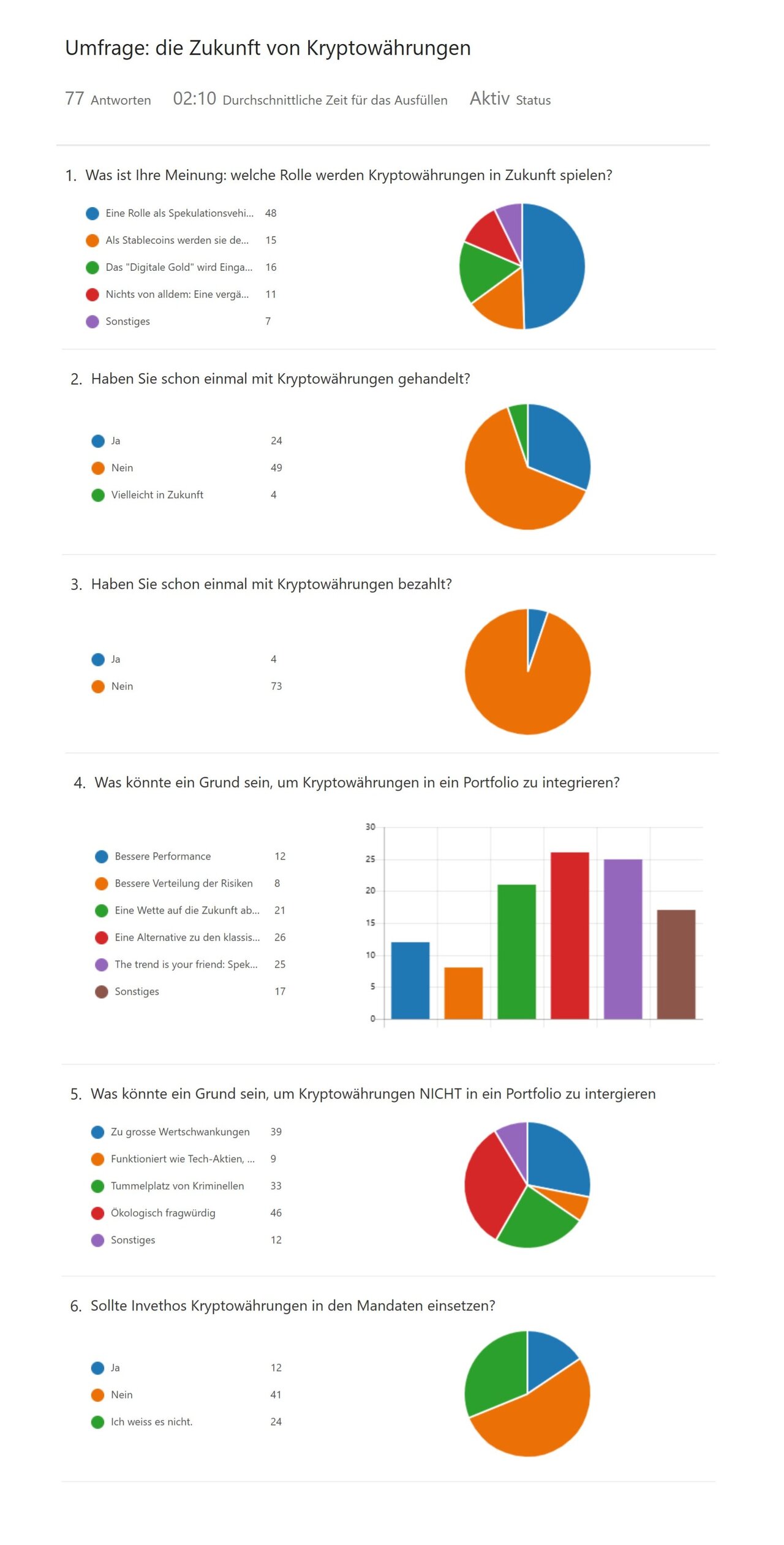 Dem entsprechend meinen auch deutlich mehr Umfrageteilnehmende (41), dass Invethos in den Mandaten Abstand halten sollte, nur 12 sind klar für den Einsatz von digitalen Assets. 24 Mal wurde die Antwort «ich weiss es nicht» angekreuzt – Zeichen dafür, dass wir es mit einem komplexen Thema zu tun haben, wo Für und Wider über gute Argumente verfügen.